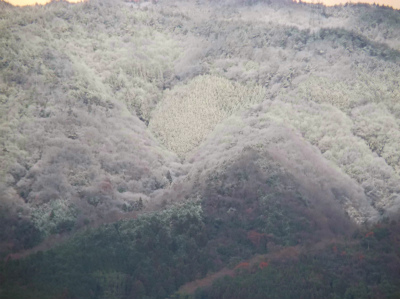 昨日に比べて、風は止んだのでそんなに寒い感じはしなかったが、どっこい早朝散歩時、洛西の山並みは、霜景色であった。うかつにも、公園の路面凍結に気づかず滑ってころんでしまった。